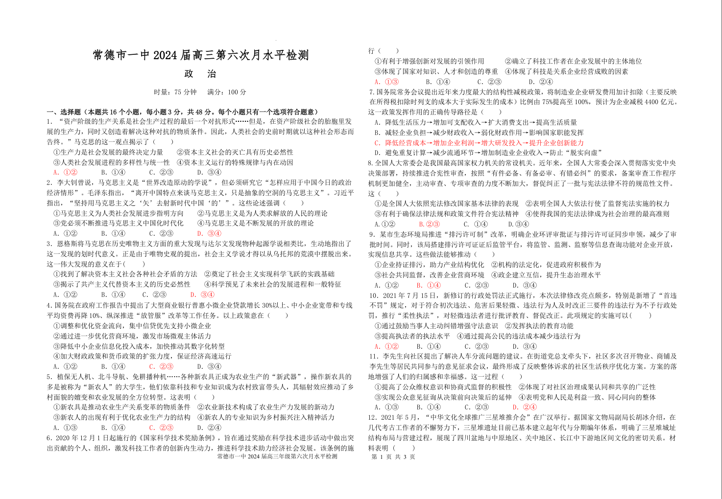 湖南省常德市第一中学2023-2024学年高三上学期第六次月考 政治