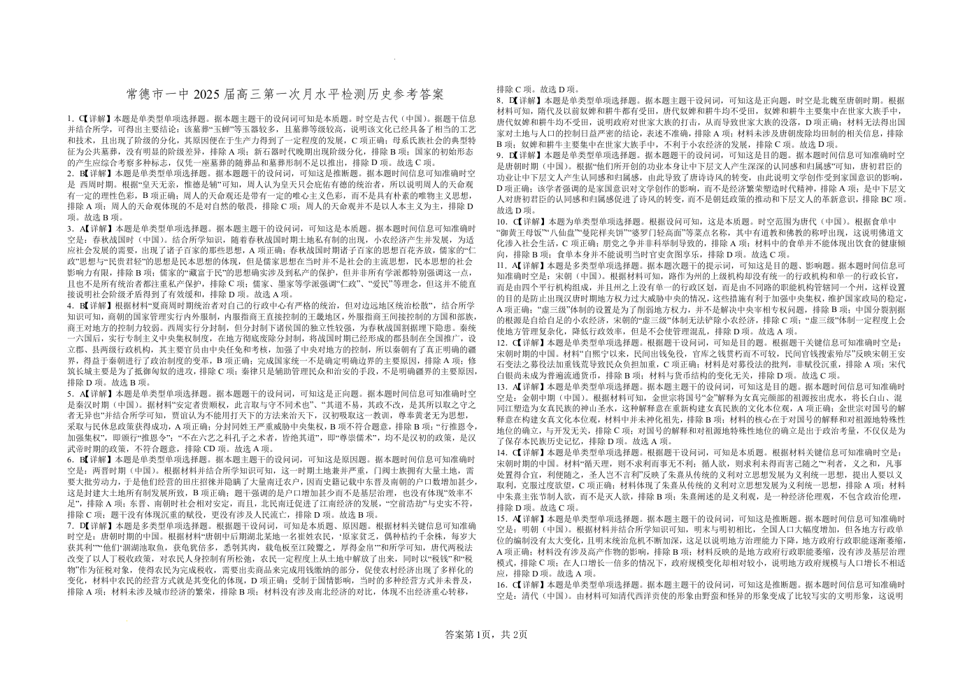 常德市一中2025届高三第一次月水平检测+历史参考答案