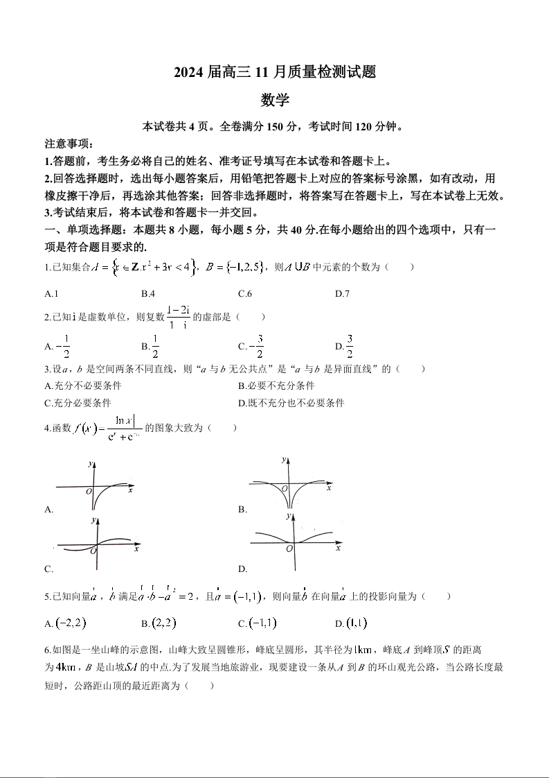 湖南省衡阳市2023-2024学年高三上学期11月质量检测 数学