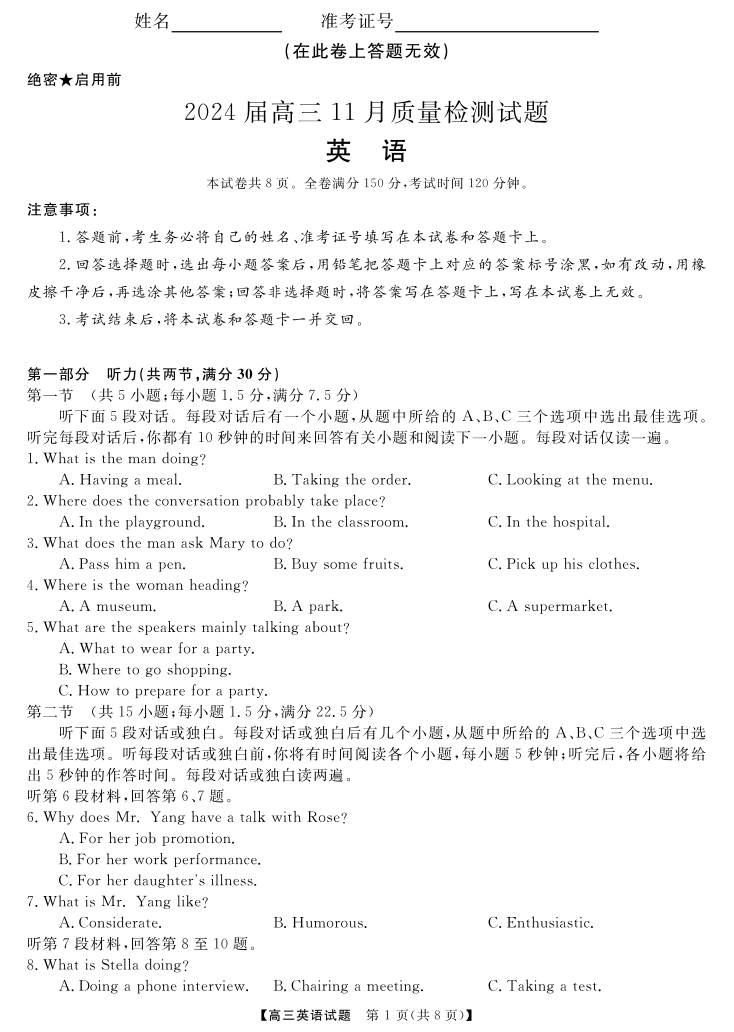 湖南省衡阳市2023-2024学年高三上学期11月质量检测 英语
