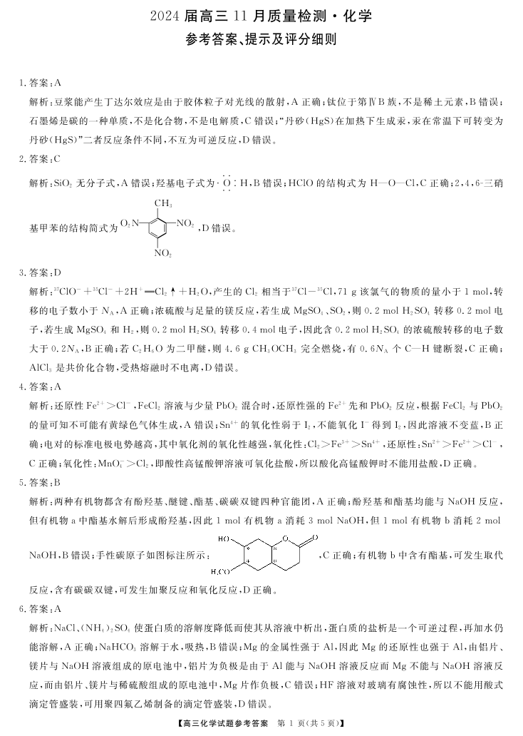 湖南省衡阳市2023-2024学年高三上学期11月质量检测 化学答案