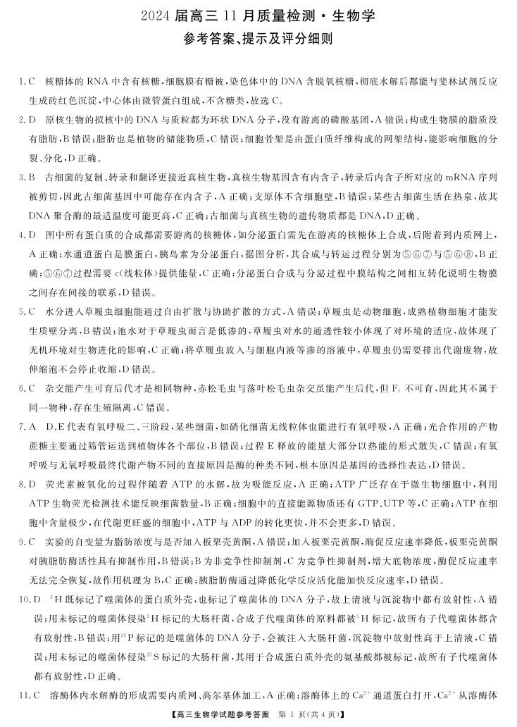 湖南省衡阳市2023-2024学年高三上学期11月质量检测 生物答案