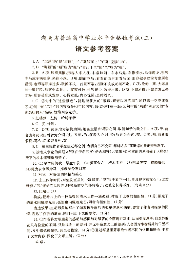 湖南省娄底市普通高中学业水平合格性考试(三)语文答案