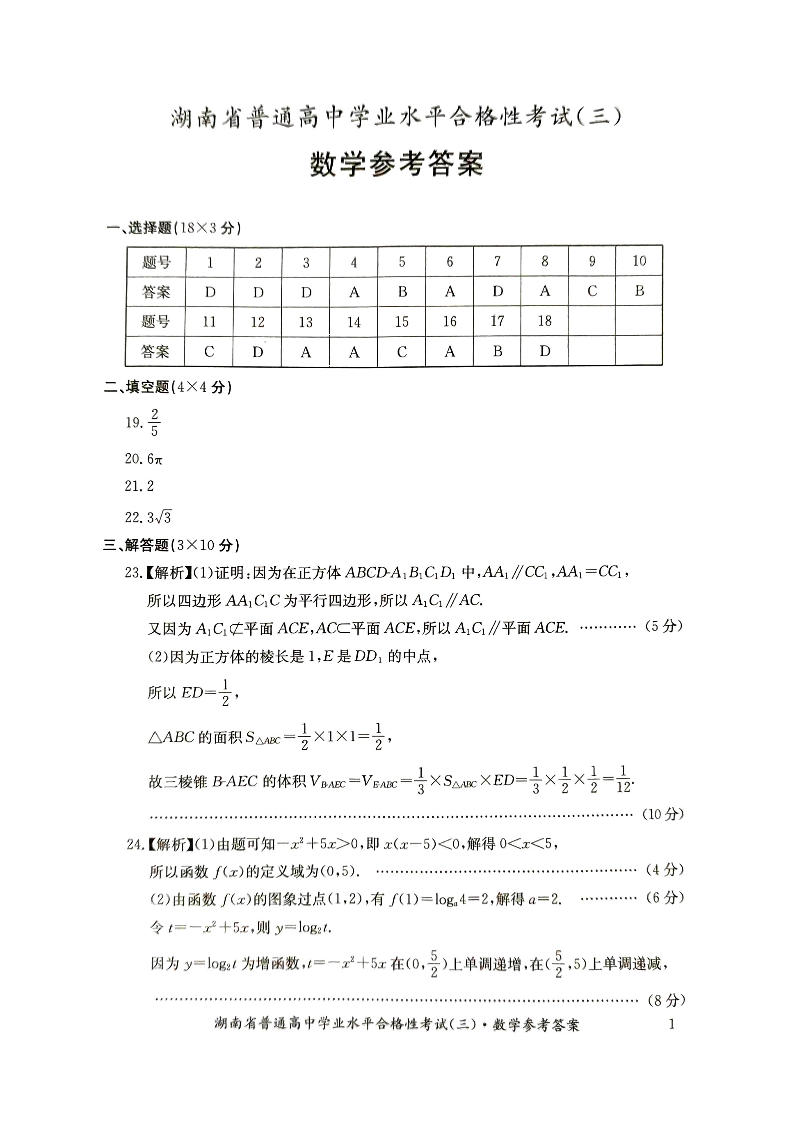 湖南省娄底市普通高中学业水平合格性考试(三)数学答案