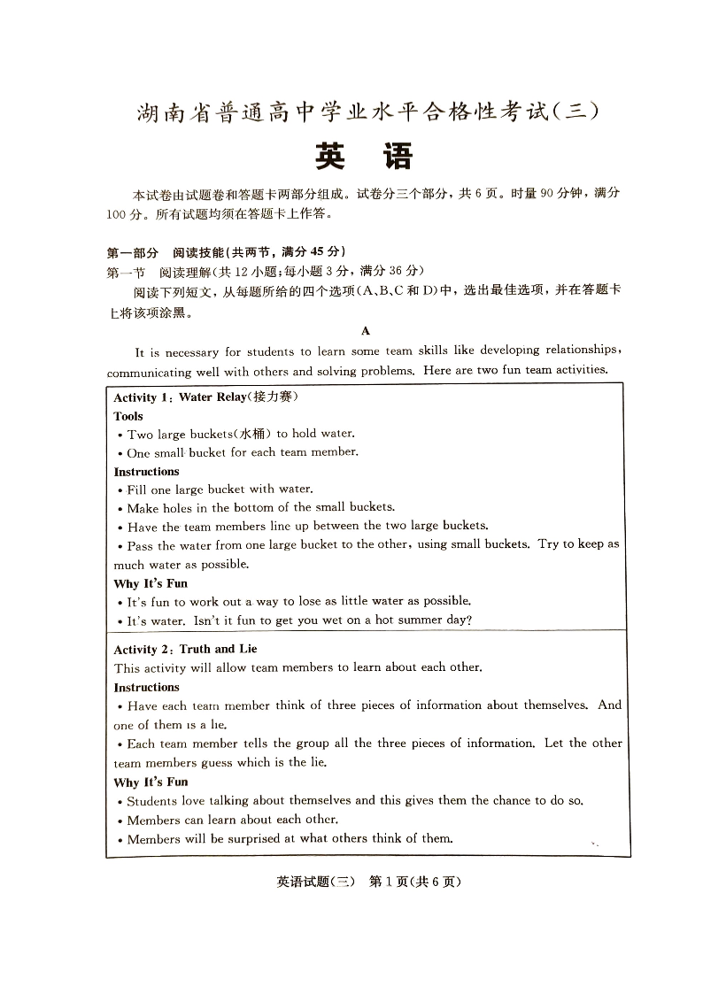 湖南省娄底市普通高中学业水平合格性考试(三)英语