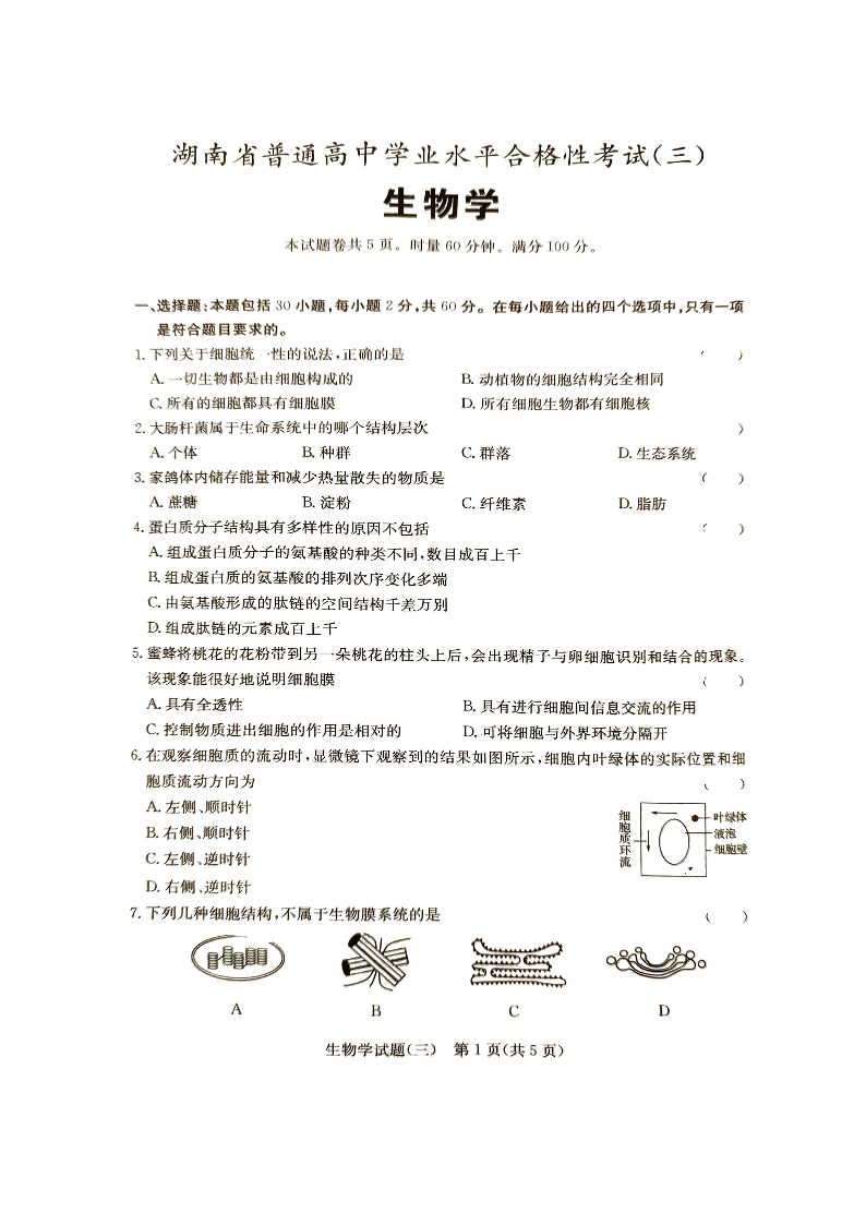 湖南省娄底市普通高中学业水平合格性考试(三)生物