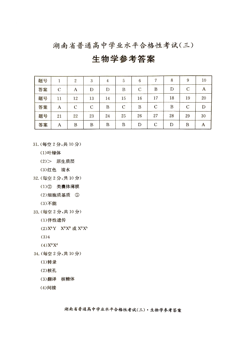 湖南省娄底市普通高中学业水平合格性考试(三)生物答案