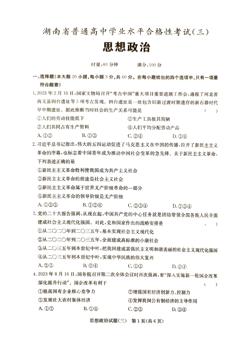 湖南省娄底市普通高中学业水平合格性考试(三)政治