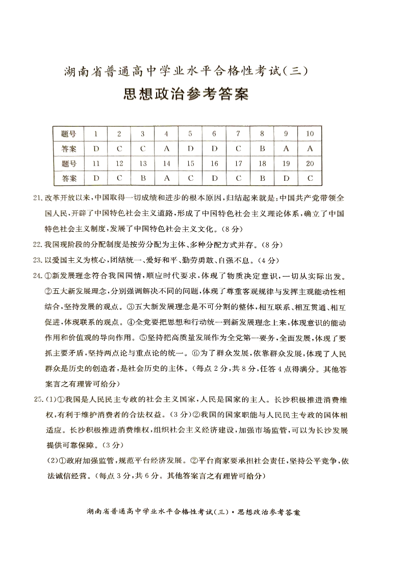 湖南省娄底市普通高中学业水平合格性考试(三)政治答案