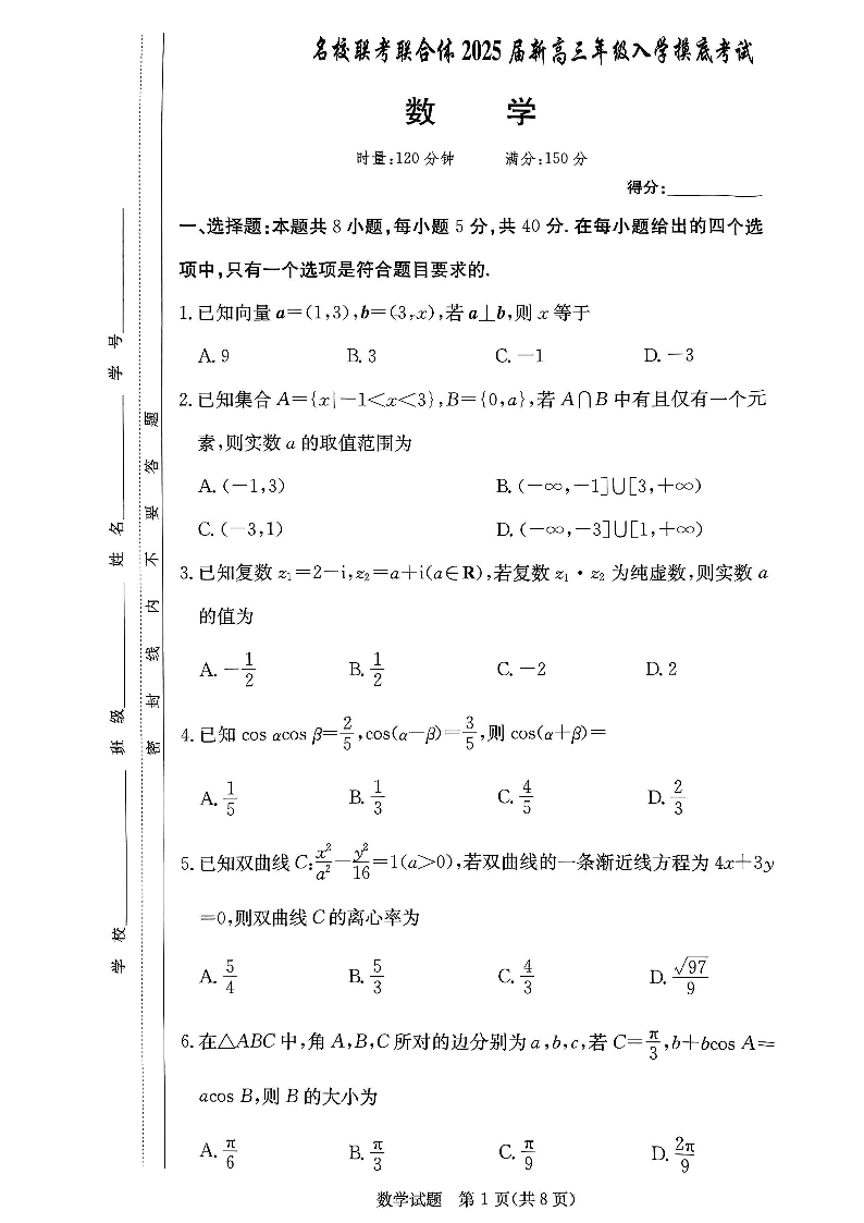 湖南省名校联合体2024-2025学年高三上学期入学摸底考试+数学
