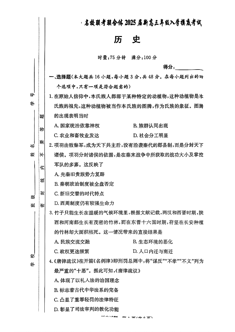 湖南省名校联合体2024-2025学年高三上学期入学摸底考试+历史