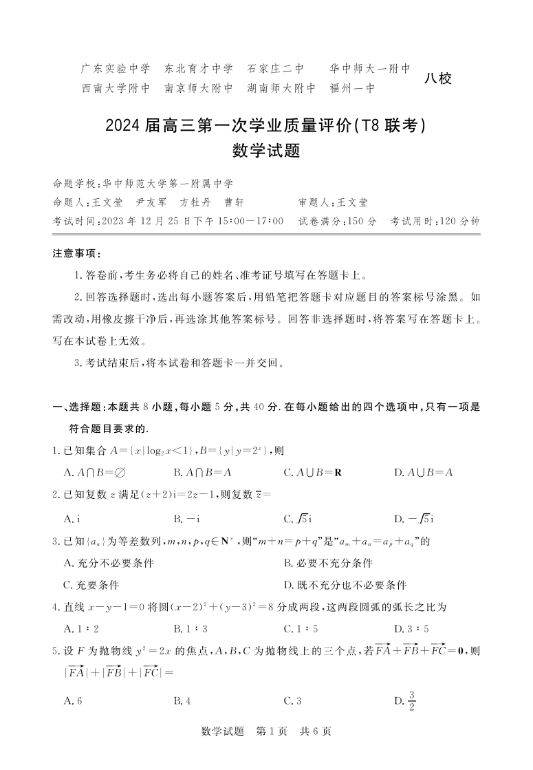 2024届八省八校高三第一次学业质量评价(T8联考)数学