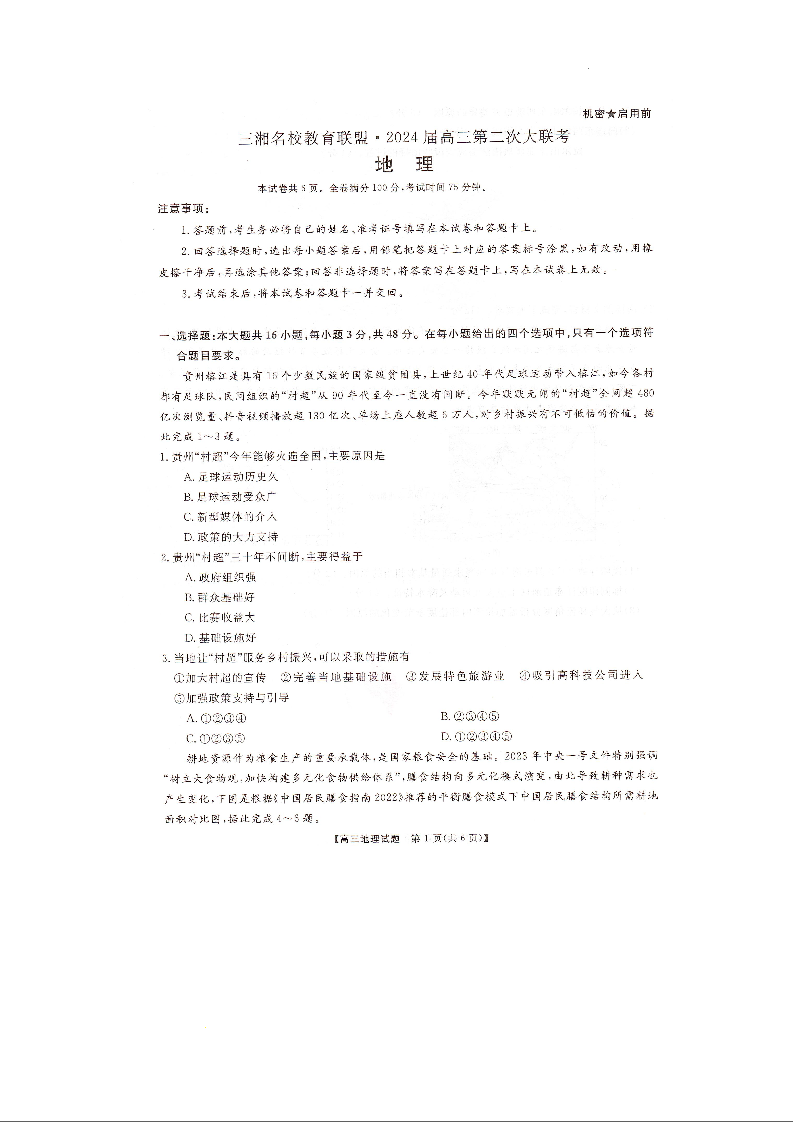 湖南省三湘名校联盟2023-2024学年高三上学期12月第二次联考 地理
