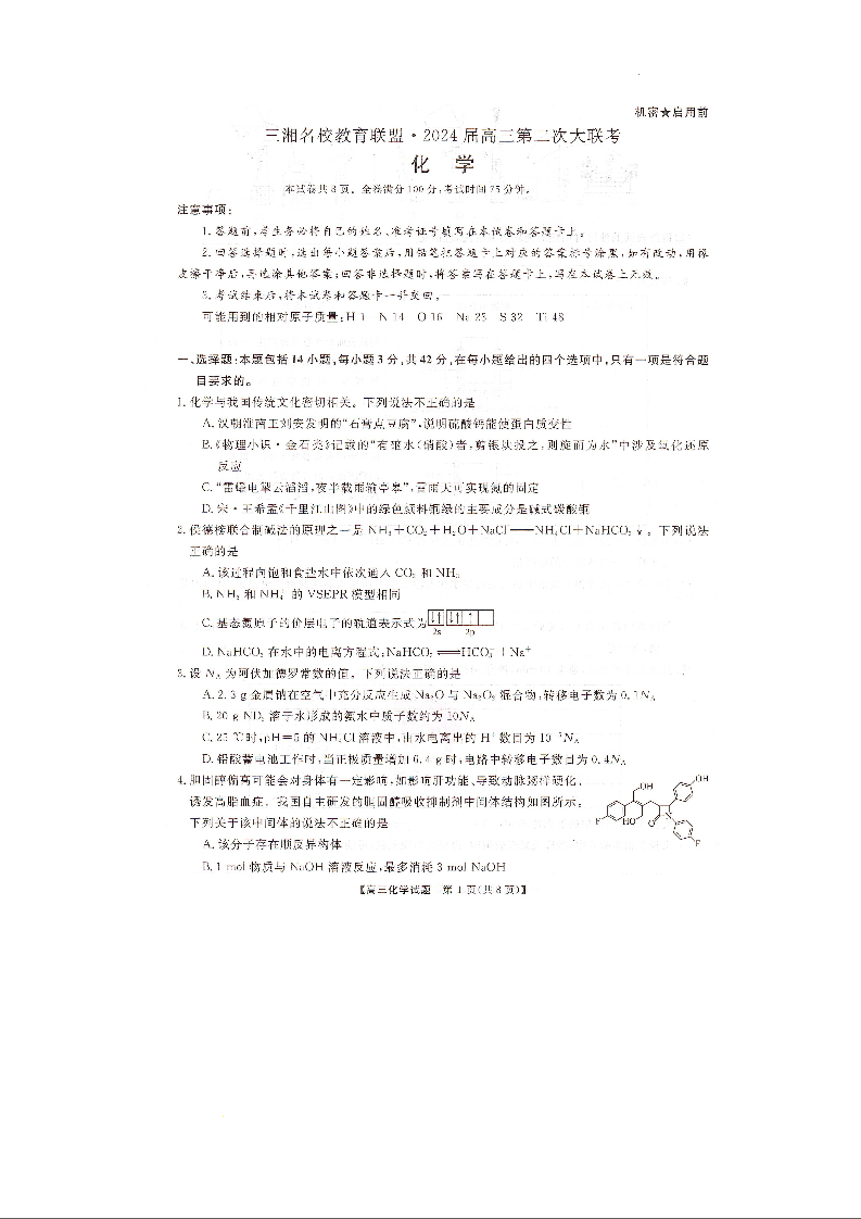 湖南省三湘名校联盟2023-2024学年高三上学期12月第二次联考 化学