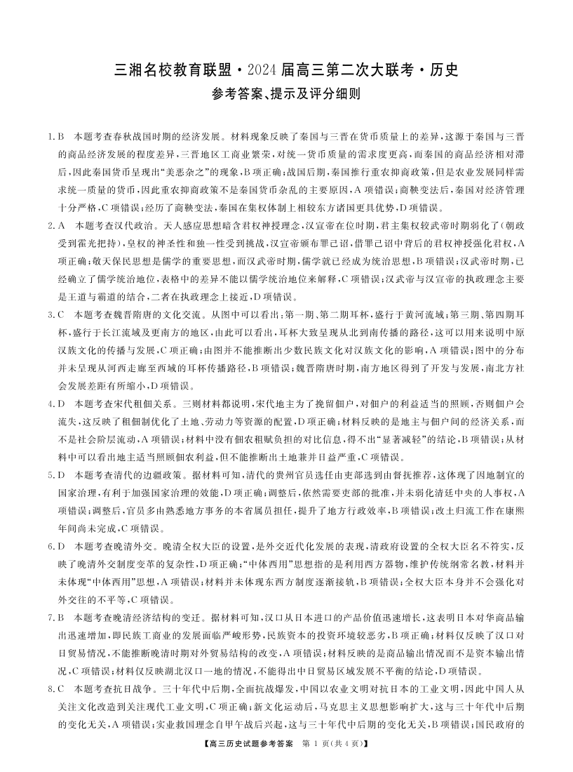 湖南省三湘名校联盟2023-2024学年高三上学期12月第二次联考 历史答案