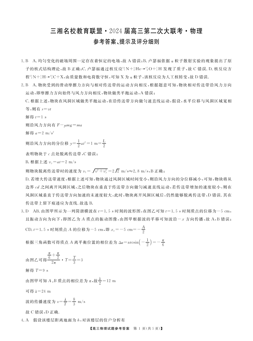 湖南省三湘名校联盟2023-2024学年高三上学期12月第二次联考 物理答案