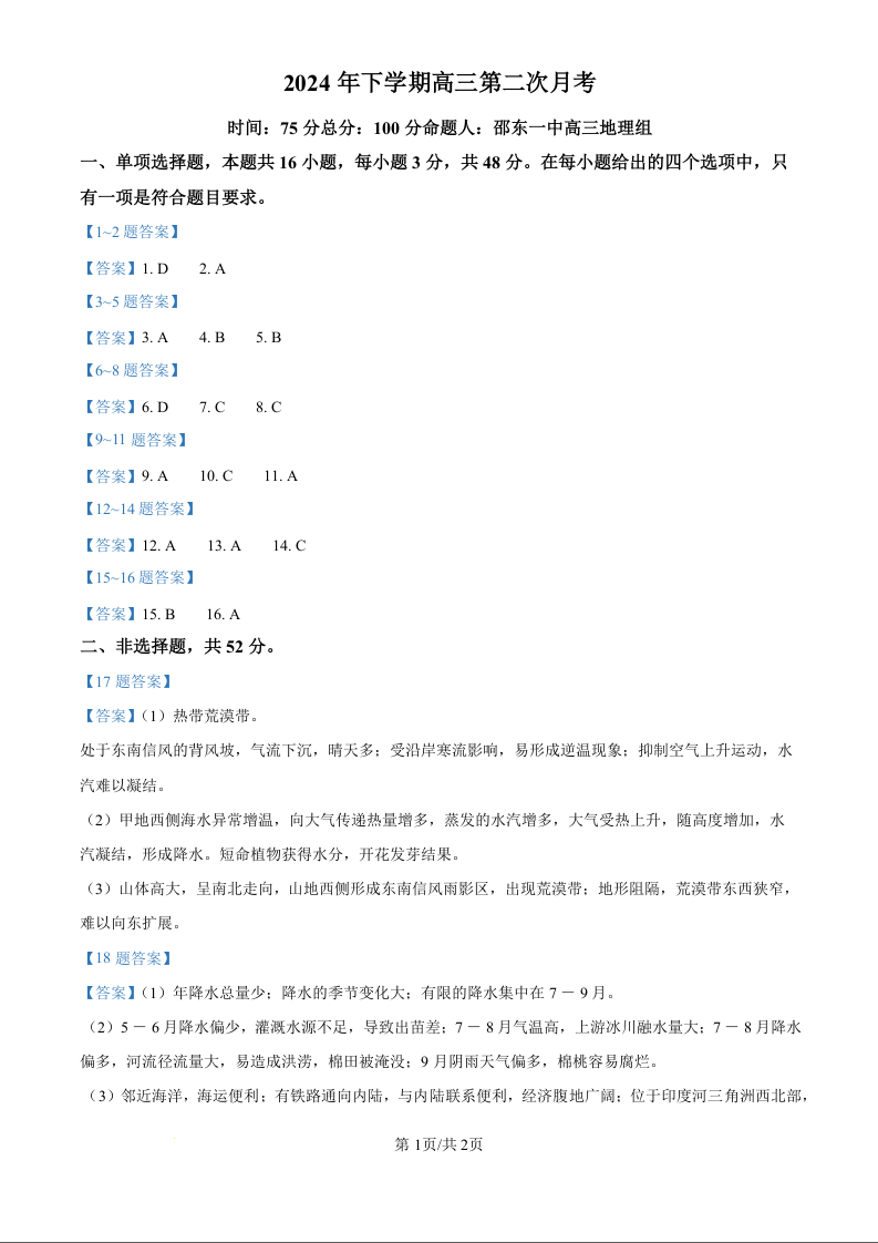 湖南省邵东市第一中学2025届高三9月第二次月考+地理答案