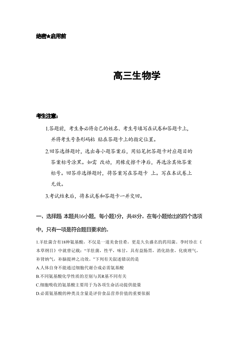 湖南省天一大联考2023-2024学年11月份高三年级三联 生物