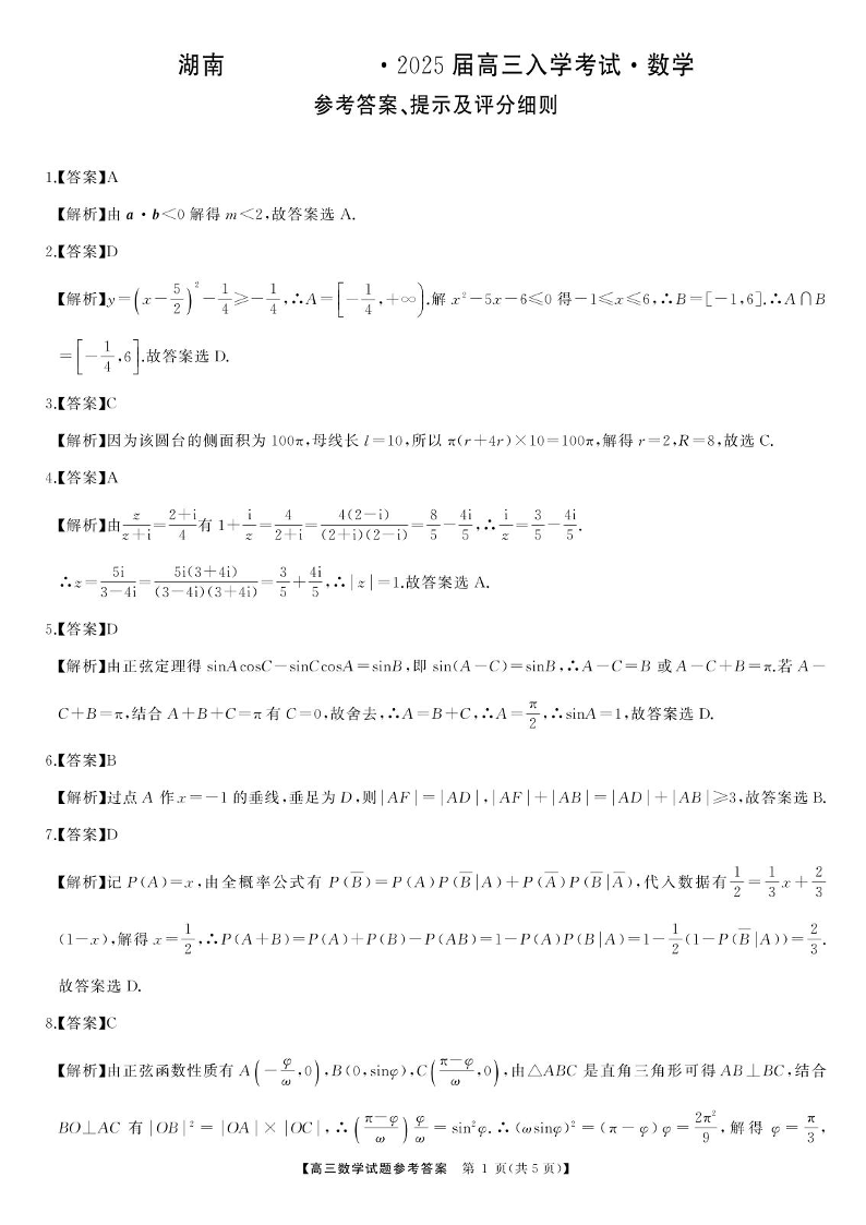 湖南省湖南天壹名校联盟2025届高三8月入学联考考试+数学答案