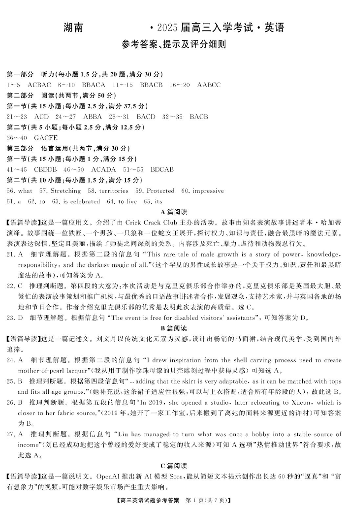 湖南省湖南天壹名校联盟2025届高三8月入学联考考试+英语答案