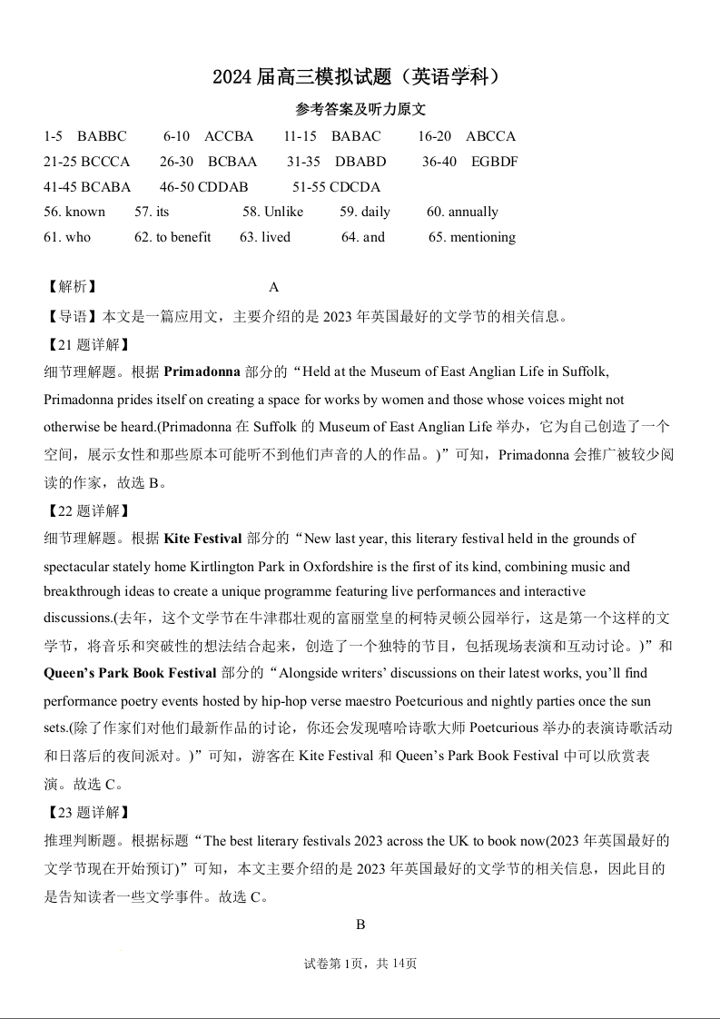 湖南省湘西州吉首市2024届高三上学期第二届中小学生教师解题大赛 英语参考答案