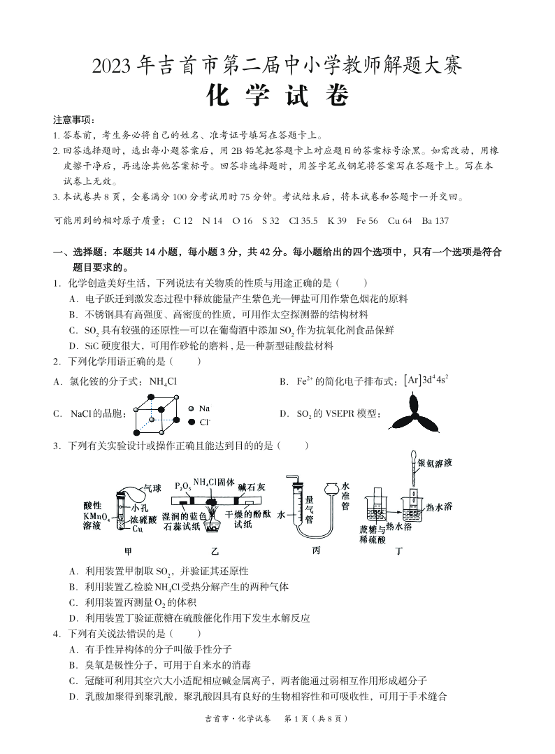 湖南省湘西州吉首市2024届高三上学期第二届中小学生教师解题大赛 化学