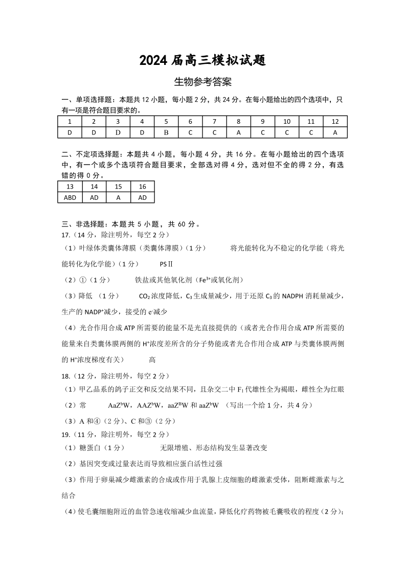 湖南省湘西州吉首市2024届高三上学期第二届中小学生教师解题大赛 生物参考答案