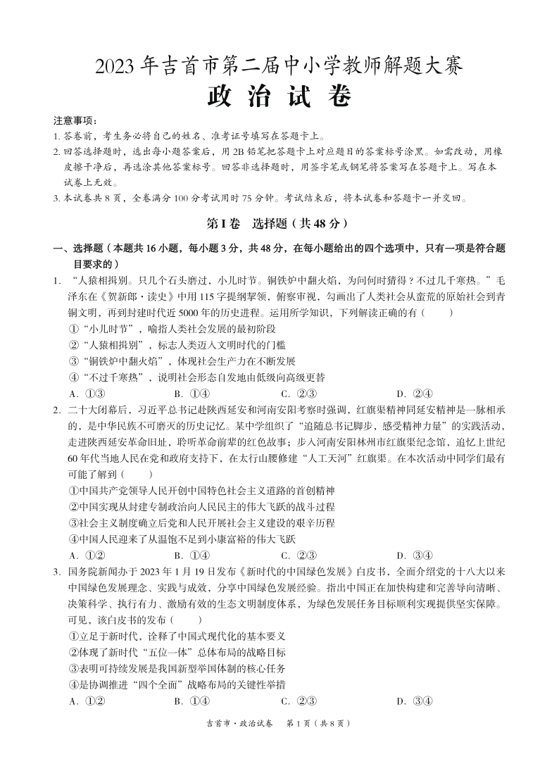 湖南省湘西州吉首市2024届高三上学期第二届中小学生教师解题大赛 政治