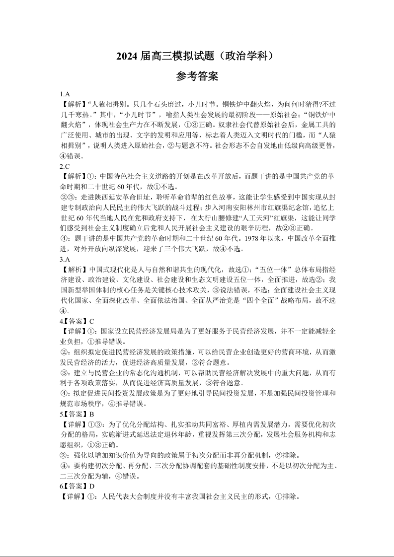 湖南省湘西州吉首市2024届高三上学期第二届中小学生教师解题大赛 政治参考答案