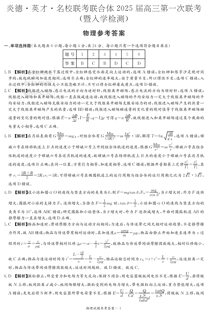 湖南省炎德英才名校联考联合体2025届高三第一次联考+物理答案