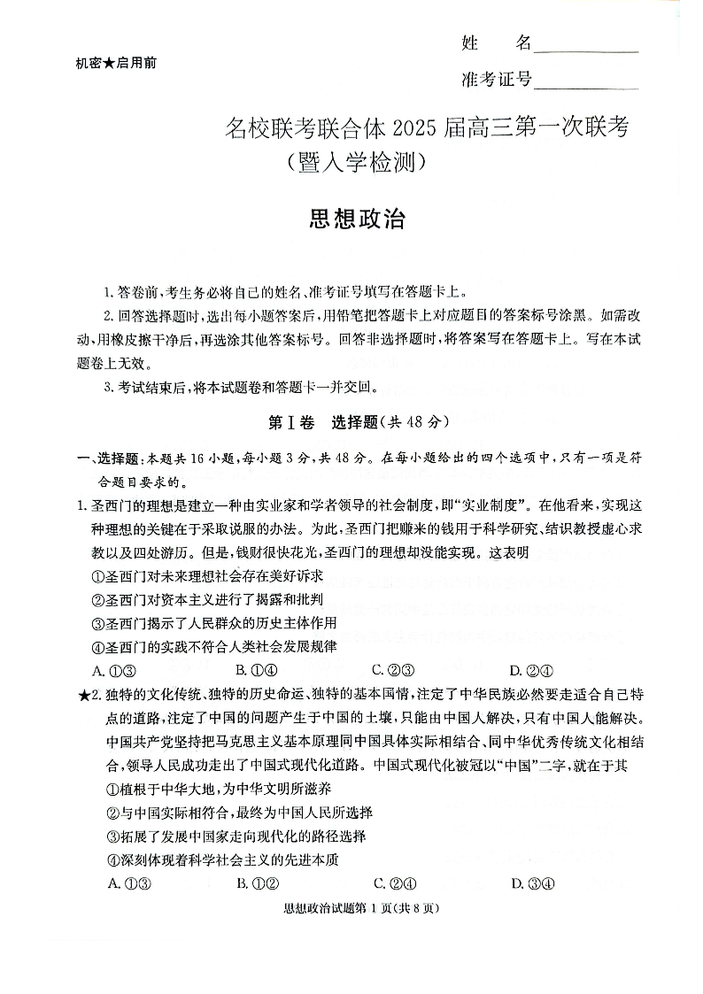 湖南省炎德英才名校联考联合体2025届高三第一次联考+政治