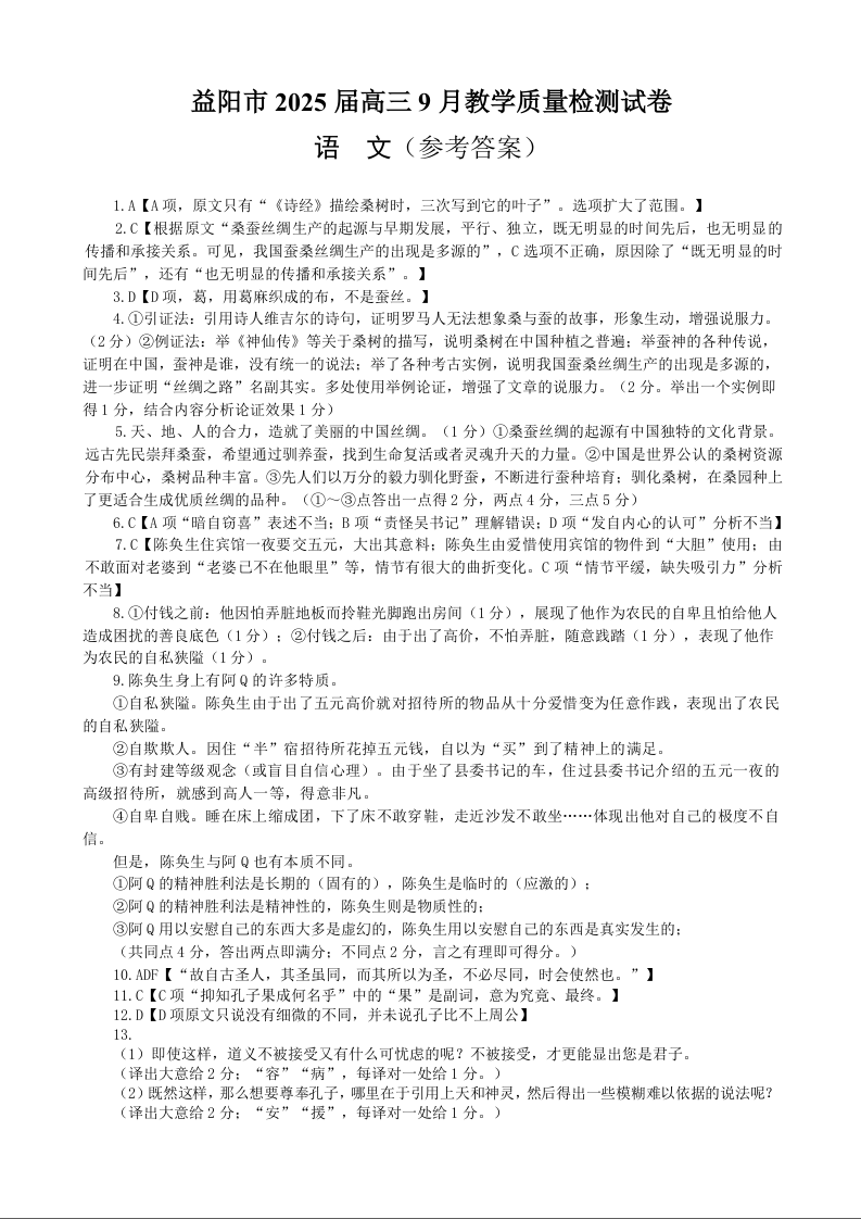 湖南省益阳市2025届高三9月教学质量检测+语文答案