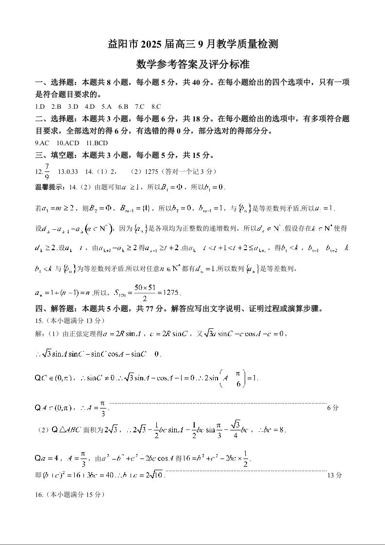 湖南省益阳市2025届高三9月教学质量检测+数学答案