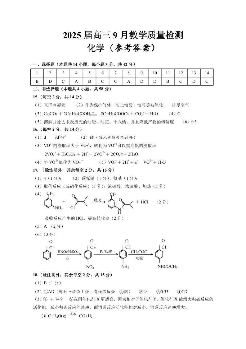 湖南省益阳市2025届高三9月教学质量检测+化学答案