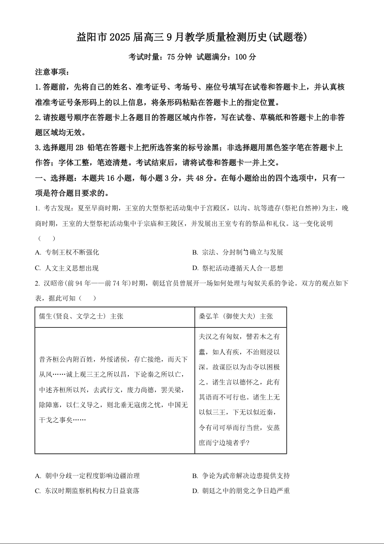 湖南省益阳市2025届高三9月教学质量检测+历史