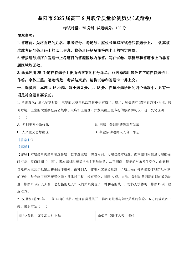 湖南省益阳市2025届高三9月教学质量检测+历史答案