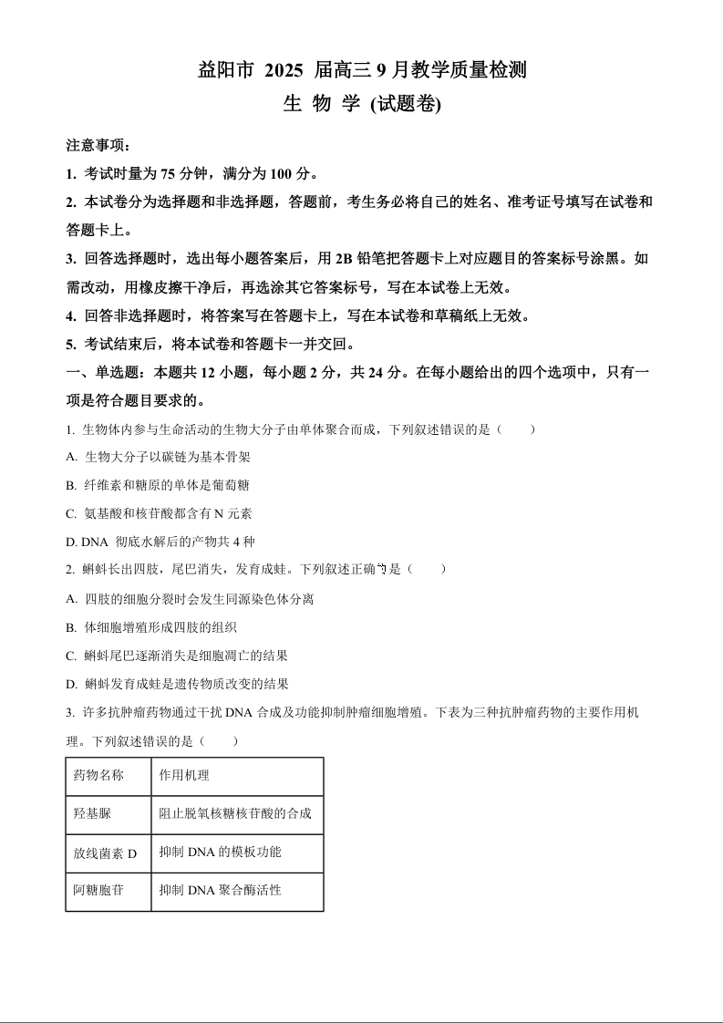 湖南省益阳市2025届高三9月教学质量检测+生物