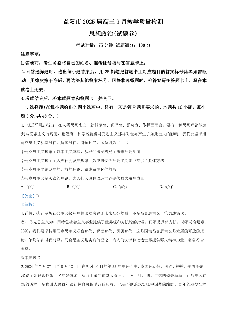 湖南省益阳市2025届高三9月教学质量检测+政治答案