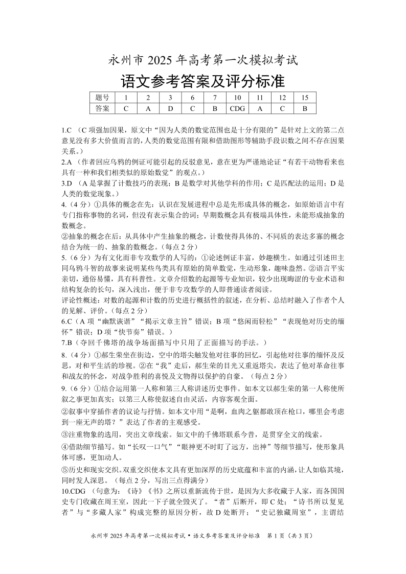 湖南省永州市2025年高考第一次模拟考试+语文答案