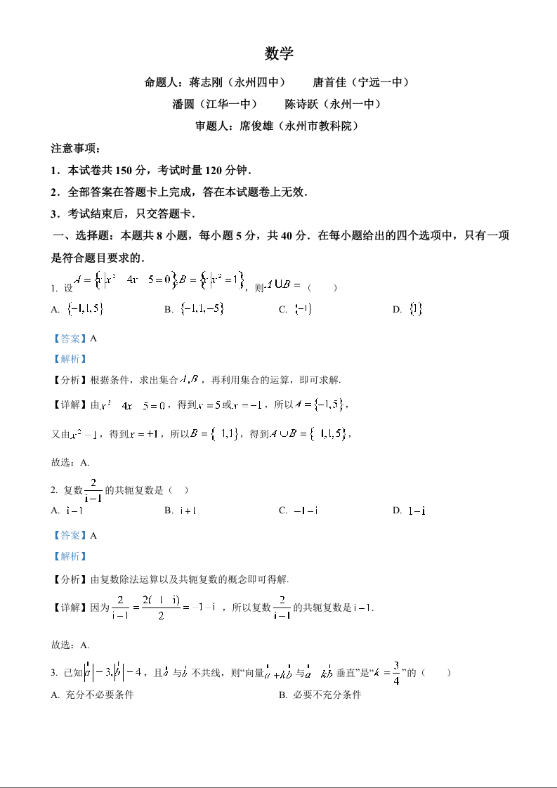 湖南省永州市2025年高考第一次模拟考试+数学答案
