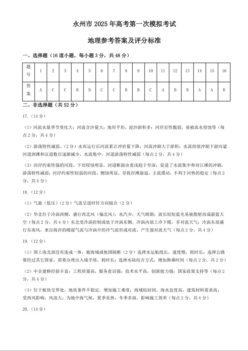 湖南省永州市2025年高考第一次模拟考试+地理答案