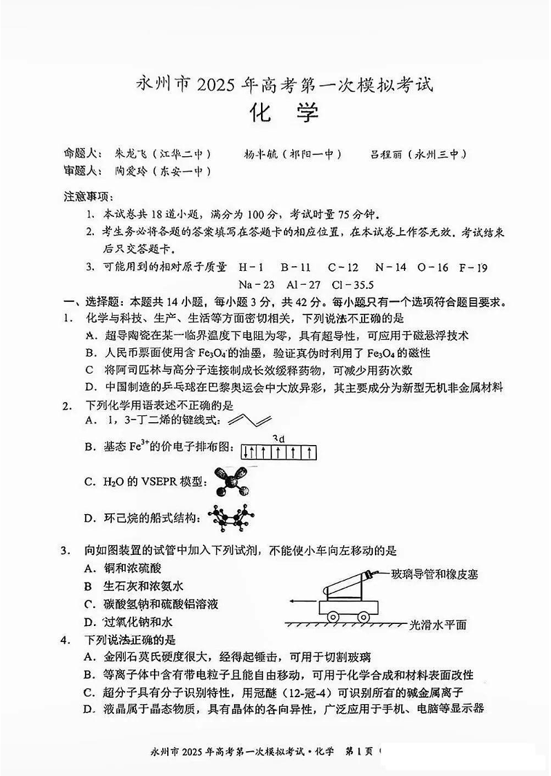 湖南省永州市2025年高考第一次模拟考试+化学