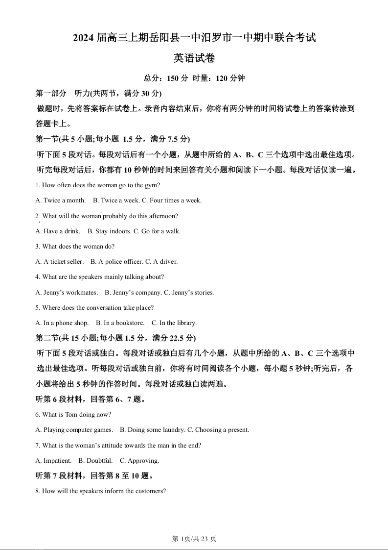 湖南省岳阳县第一中学、汨罗市第一中学2023-2024学年高三上学期11月期中联考 英语答案