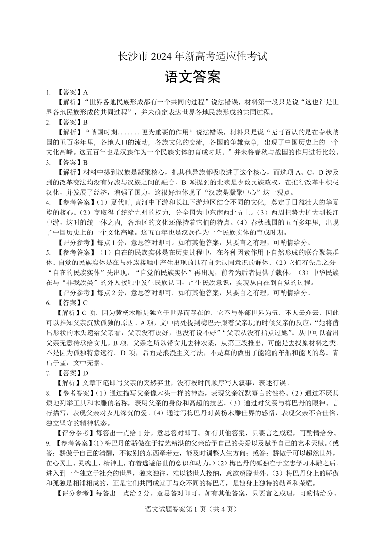 湖南省长沙市2024年新高考适应性考试 语文答案