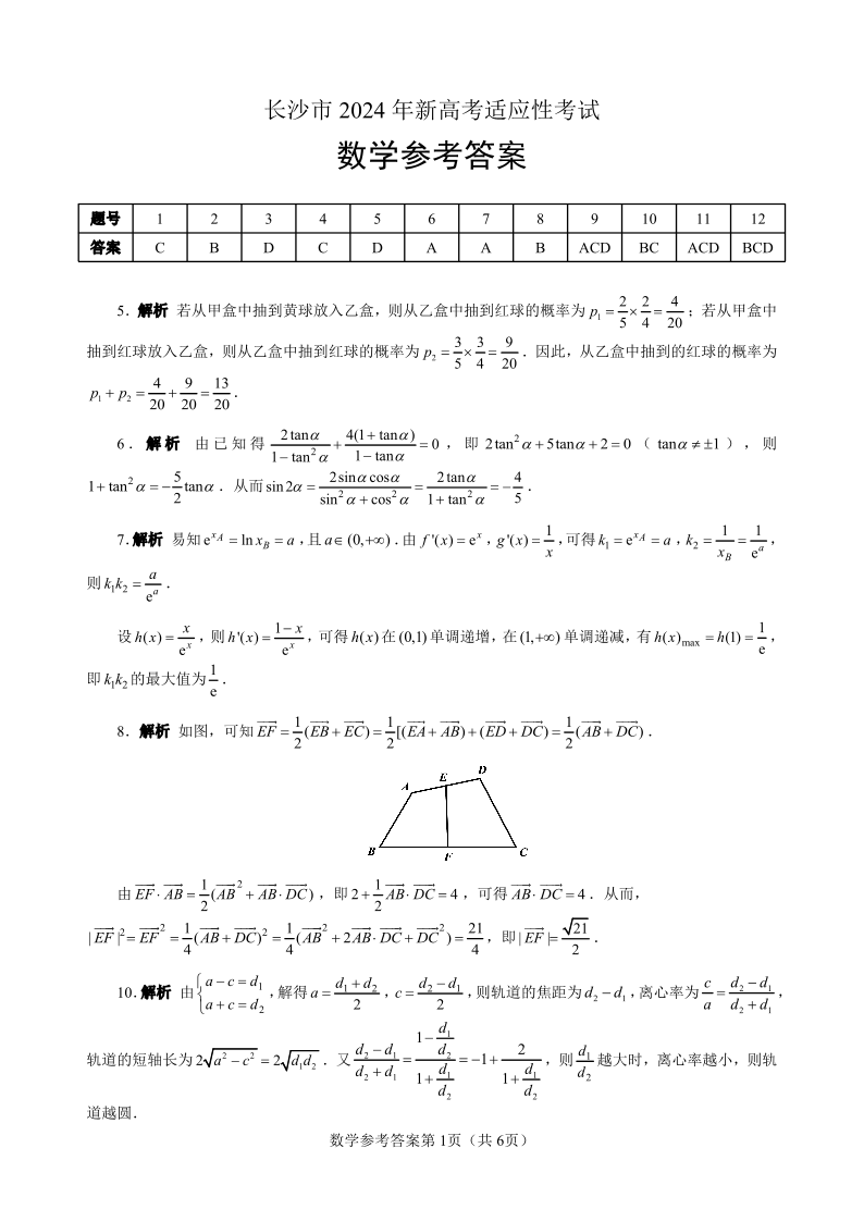 湖南省长沙市2024年新高考适应性考试 数学答案