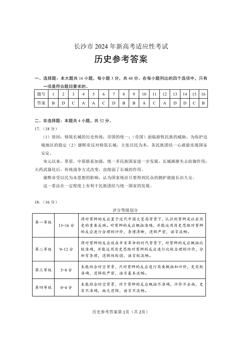 湖南省长沙市2024年新高考适应性考试 历史答案