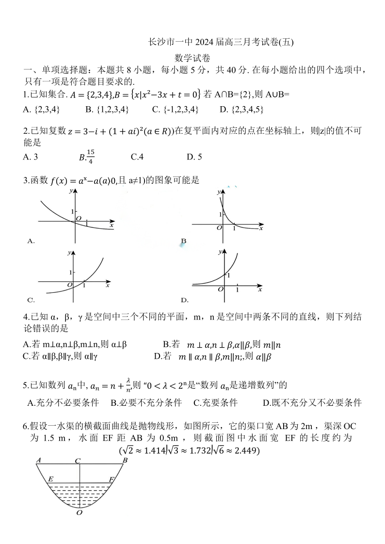 湖南省长沙市第一中学2023-2024学年高三上学期月考(五)数学