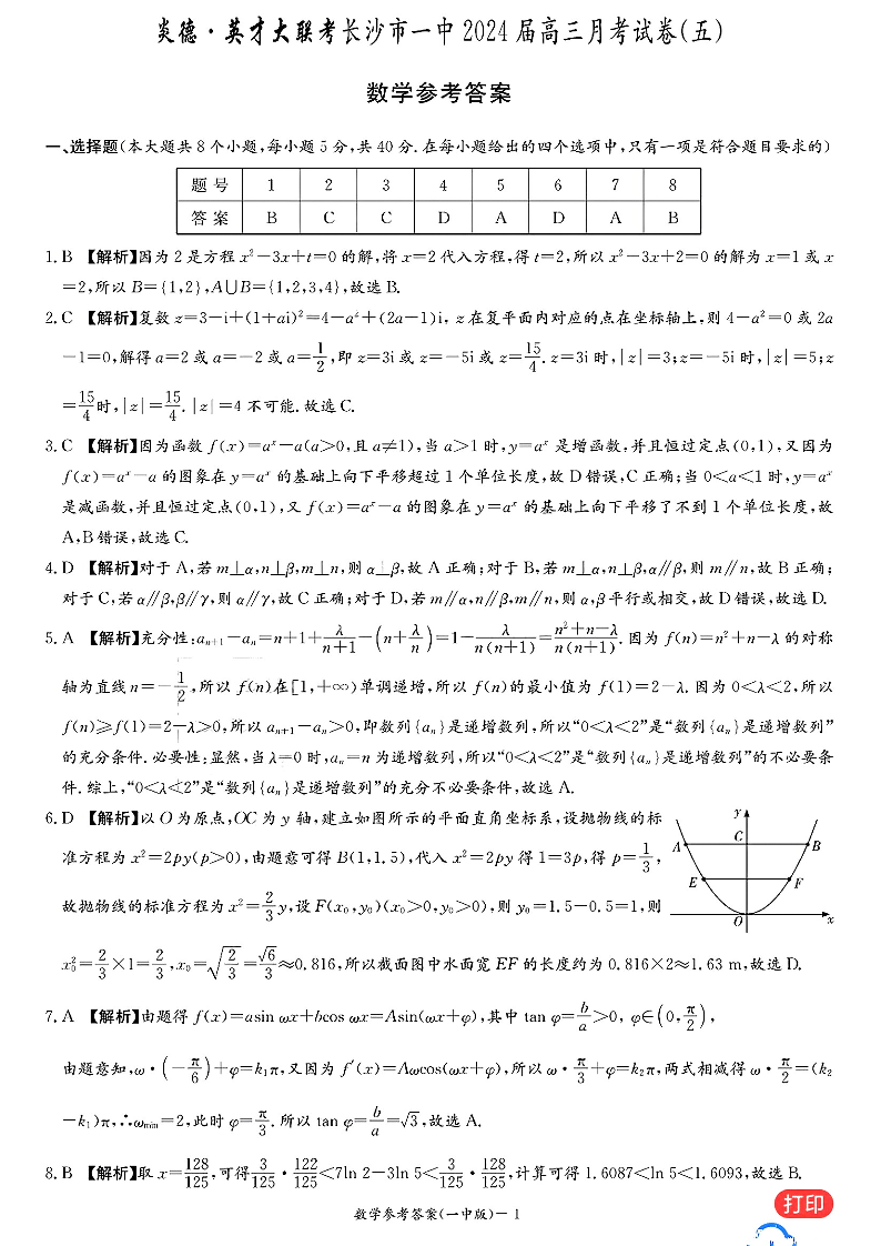 湖南省长沙市第一中学2023-2024学年高三上学期月考(五)数学答案