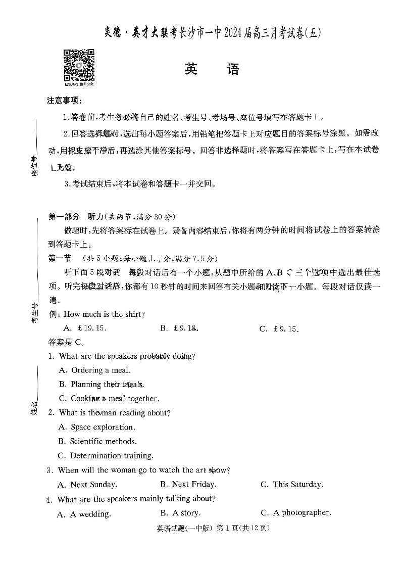 湖南省长沙市第一中学2023-2024学年高三上学期月考(五)英语