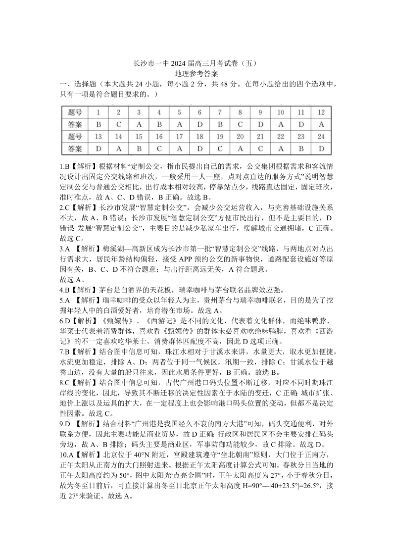 湖南省长沙市第一中学2023-2024学年高三上学期月考(五)地理答案
